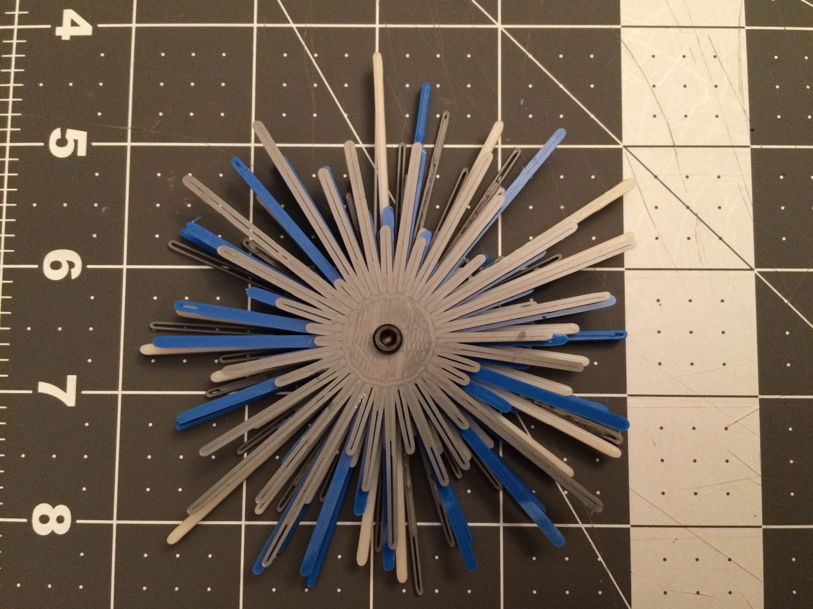 Assembling the models introduces additional randomness since the rays all align differently. Additionally, the resolution of my Thing-O-Matic leaves some gaps in some rays, which adds to the randomness of each ray. The gaps leave convenient places for me to string monofilament to hang the ornaments.